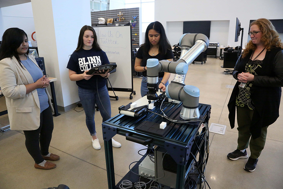 Walbeck manages the Innovation Center , located in the sparkling $35.5 million Science, Technology, Engineering, and Innovation (STEI) Building on Blinn’s Brenham Campus . The STEI Building, which opened last fall, houses classes in anatomy and physiology, biology, chemistry, computer science, cybersecurity, engineering, geology, information technology, microbiology, nursing, organic chemistry, and physics.