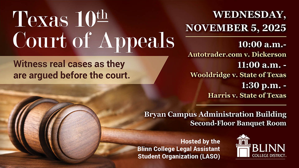 The Blinn College District invites students and the public to witness precedent-setting appellate cases when the Texas 10th Court of Appeals holds session in the Blinn College-Bryan Campus Administration Building (map) on Wednesday, Nov. 5.